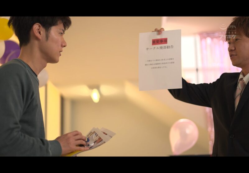 順調に部員を集めていたコスプレサークルだったが、勧誘方法があまりにも卑猥すぎると説教を受ける男子学生